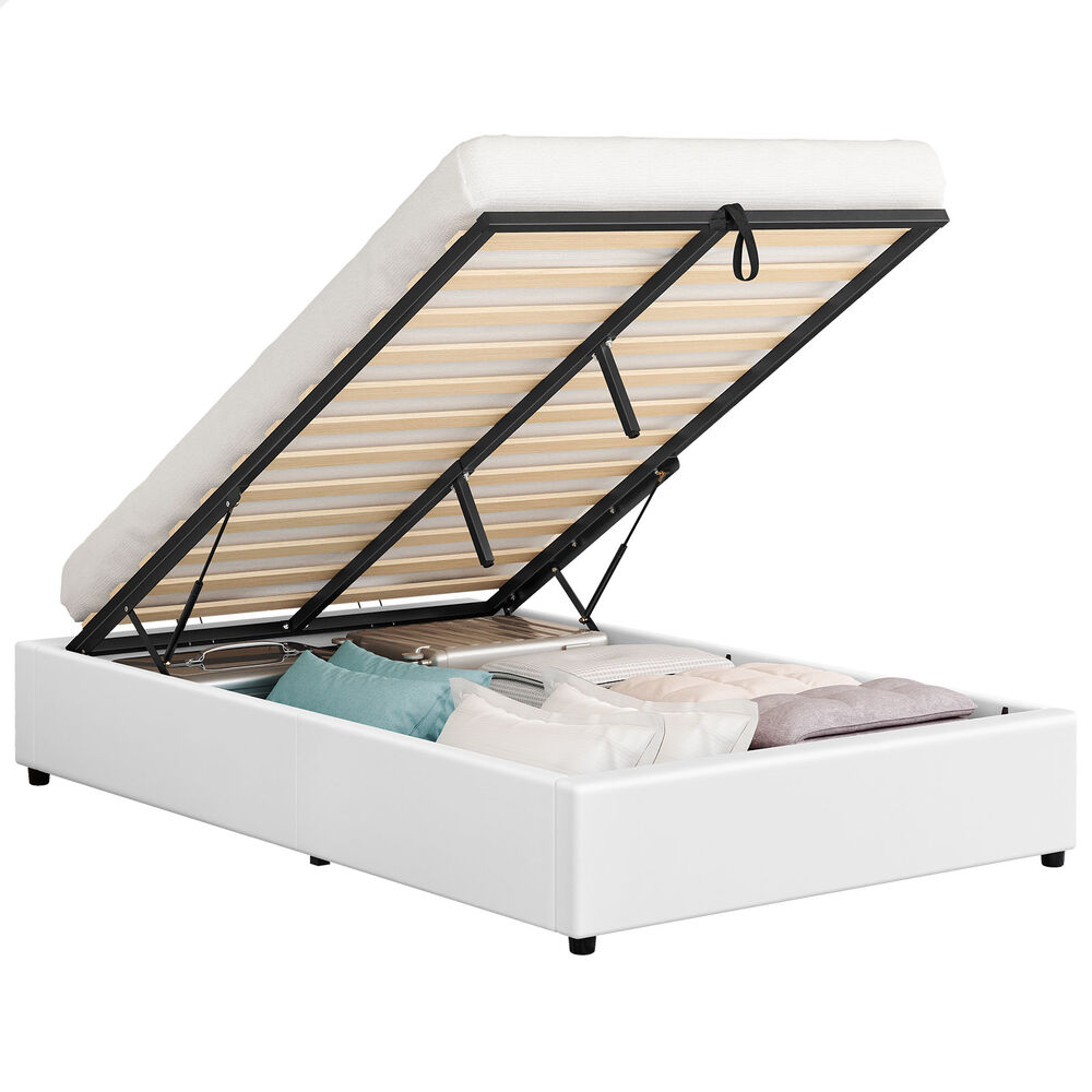 Quality counts - Constructed of durable wood slats and reinforced with exclusive X-support frame, this bed frame provides you with full sense of security. The heavy-duty gas lift mechanism allows you to effortlessly raise the mattress platform, providing easy access to the storage compartment. What's more, with adhesive Velcro strips, you can just lay the slats down, without inserting slats one by one at both end caps. Enjoy hassle-free installation!