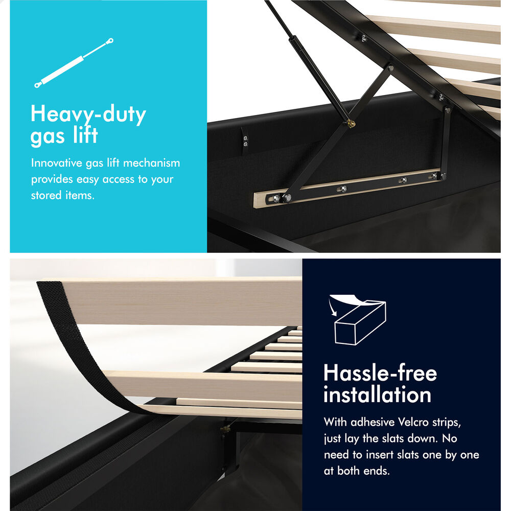 Quality counts - Constructed of durable wood slats and reinforced with exclusive X-support frame, this bed frame provides you with full sense of security. The heavy-duty gas lift mechanism allows you to effortlessly raise the mattress platform, providing easy access to the storage compartment. What's more, with adhesive Velcro strips, you can just lay the slats down, without inserting slats one by one at both end caps. Enjoy hassle-free installation!
