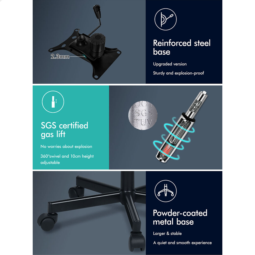 During tasks like computing, gaming, or short rests, the reclining feature helps you achieve an optimal angle. The tilt can be engaged for moments of relaxation and secured firmly for an upright, attentive posture. Built with a robust chrome foundation, wheels certified by TUV, and a gas lift mechanism approved by SGS, this desk chair is made to last. Concerns regarding instability or component failure are minimized. The ability to rotate freely and adjust the seat height offers further practicality.