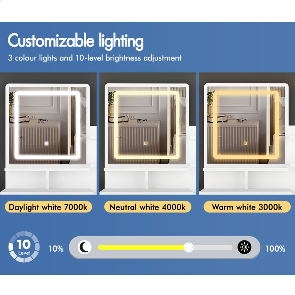 Customizable lighting - Good lighting is important to achieve your perfect glam look. The dressing table features 3 LED light colours - neutral white, warm white, and daylight white and the brightness of each colour can be adjusted in 10 levels, providing adequate light to complete your make-up.