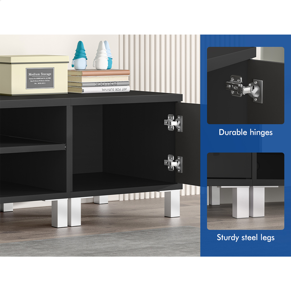 Reliable quality - Made of superior E1 grade and 15mm thick particle board, our entertainment unit is durable and resistant to scratches. Instead of flimsy paper finish, it is well made with smooth melamine finish which is easy to maintain and long lasting. Equipped with built-in anti-tip device on the back and, it provides extra stability on any space. Last but not least, supported by elevated legs, this TV unit offers ample clearance for efficient and effortless cleaning.