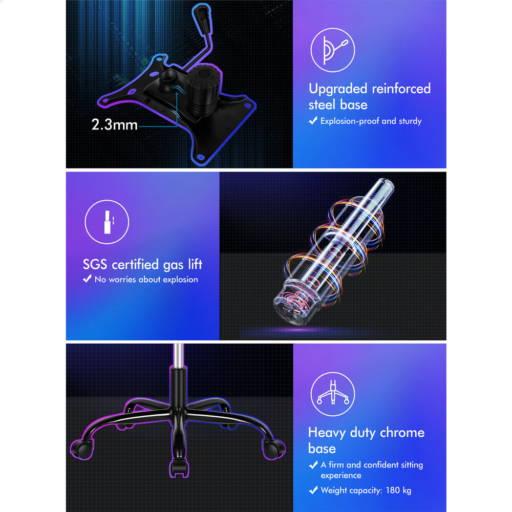 A stylish chrome base with TUV certified casters, Intertek approved PU leather, SGS approved Gas-Lift system and tilt function, the gaming office chair is sure to deliver absolute five star luxury.
