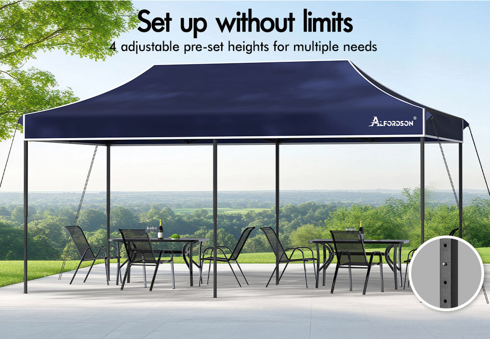 Our gazebo features a roomy layout that can host sizable gatherings, making it perfect for lively markets, exciting sports events, scenic camping trips, colourful garage and yard sales, enchanting school celebrations, and appealing trade show exhibits. Its portable design makes it easy to transport your gazebo on travels or camping trips.