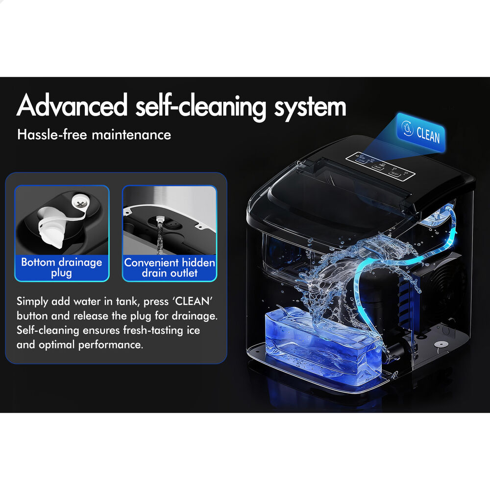 Effortless self-cleaning system - The food-grade 304 stainless steel and certified PP plastic ensure every batch of ice is fresh-tasting. Maintain optimal performance with the advanced self-clean function - simply add water, press the "clean" button, and drain. Hassle-free maintenance has never been this simple.