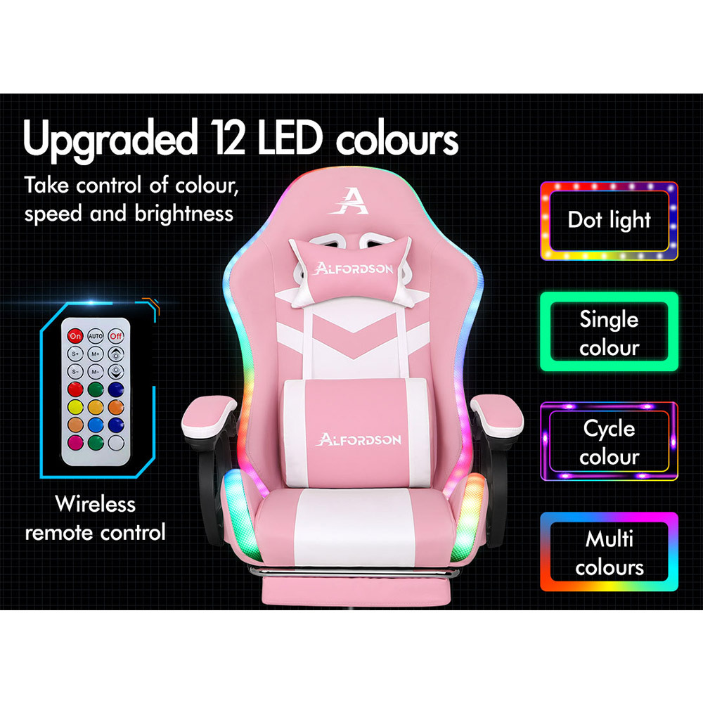 ALFORDSON Massage Gaming Chair 12 RGB LED Footrest Pink & White