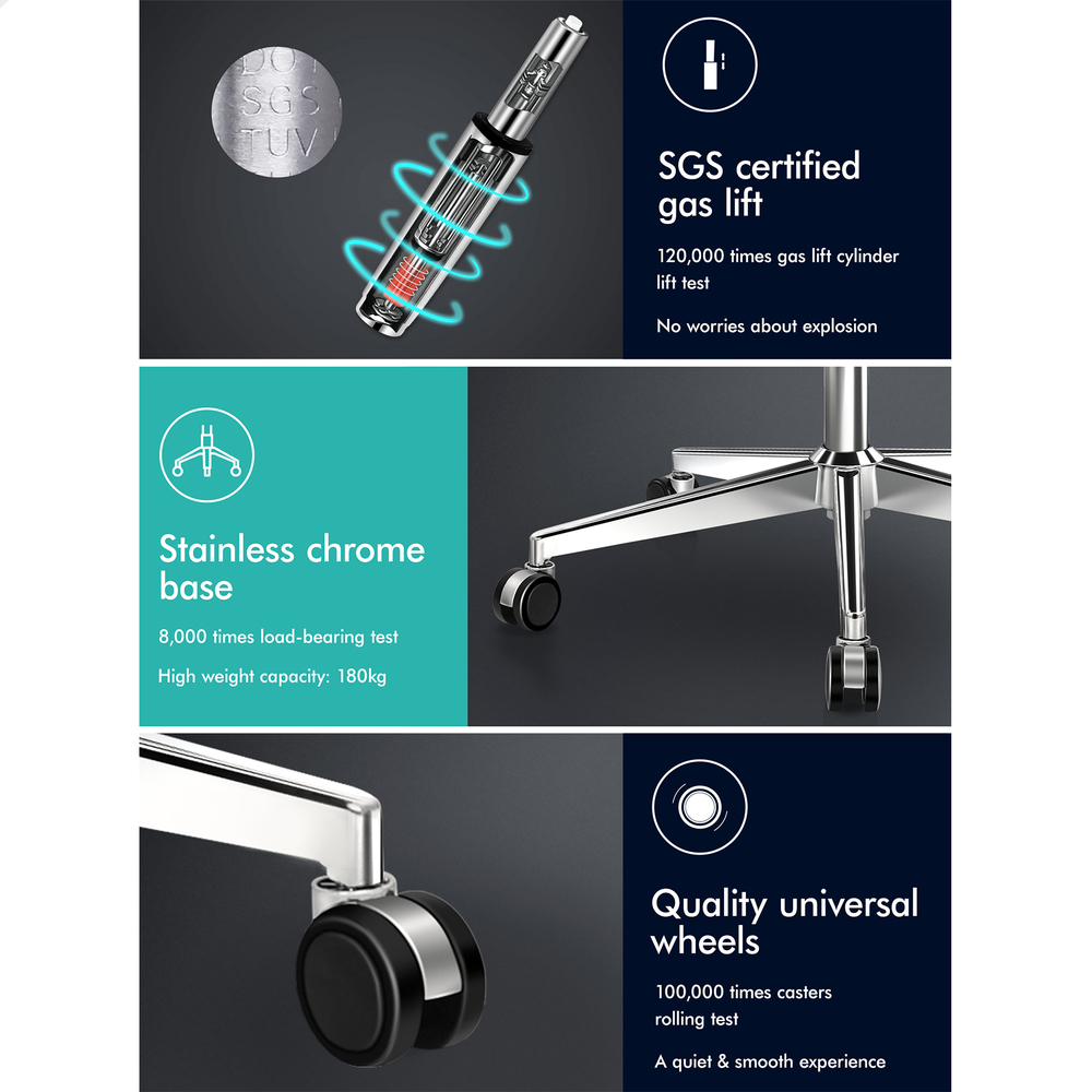 Glide smooth on a reinforced base - Constructed with a sturdy chrome base, TUV certified casters and SGS approved Gas-lift system, the chair is endurable. You don’t have to worry about tipping over or exploding. The 360 degree swivel and height adjustable seat adds more convenience.