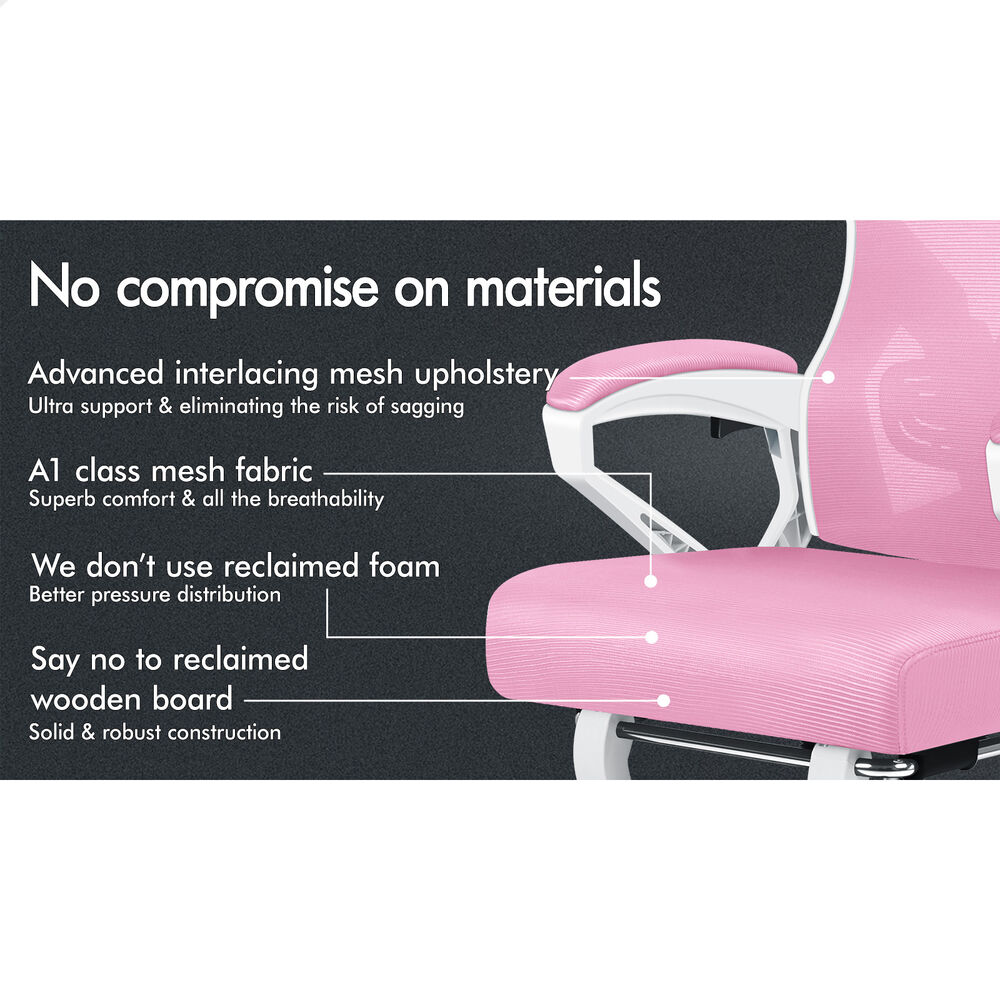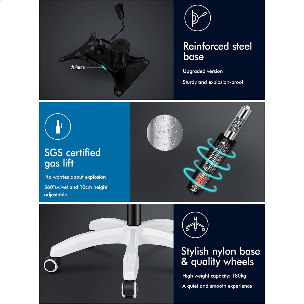 Combined with retractable footrest, our generous 150 degree of recline and sturdy tilt mechanism accommodates effortlessly to your favorite posture while sitting, sleeping or playing games, whether you're sitting straight or leaning back. The home office desk chair features a stylish nylon base with TUV certified casters, Intertek approved mesh fabric, SGS approved Gas-Lift system and tilt function, delivering absolute five star luxury.