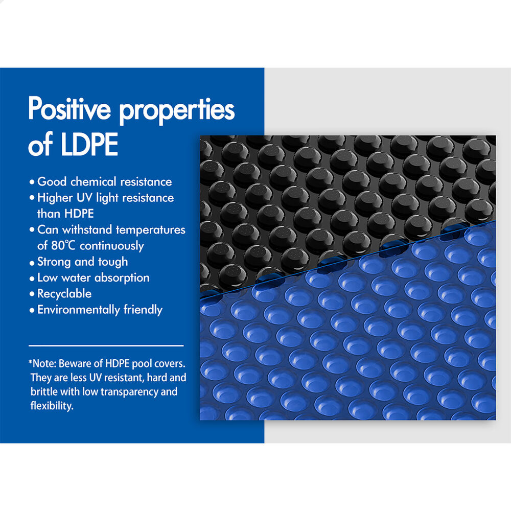 Blue/Black isothermal – The two-toned design combines functionality and practicality. The translucent blue top layer preserves solar energy absorption, allowing sunlight to warm the pool water naturally. The dense black underside takes performance further: it blocks 98% of UV rays and direct sunlight from penetrating the water, stopping algae from photosynthesizing—so you'll spend less time scrubbing algae and less money on algaecides. The unique design means maximum insulation and minimized heat and water loss.