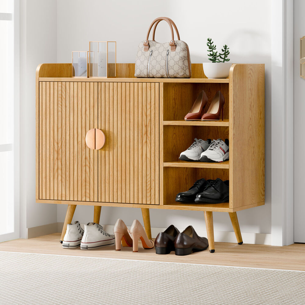 Not only will it add a touch of elegance to your home, but the shoe cabinet bench also effortlessly declutters your space. By storing up to 18 pairs of children's shoes or 10-13 pairs of ladies' or men's shoes, it feaures 3-tier shelves in 2-door cabinet, which are adjustable according to the size of your shoes: flat shoes, high heels, sneakers or slippers. The 3 additional open shelves at the right side fits up to 3 shoes for quick access of your everyday shoes with ease.