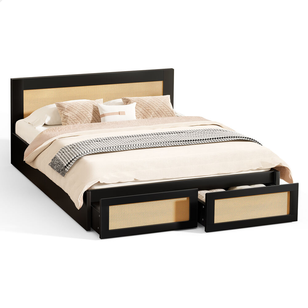 ALFORDSON Wooden Bed Frame Double Size Rattan Bed Base with Storage Drawer Black
