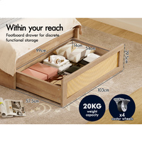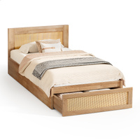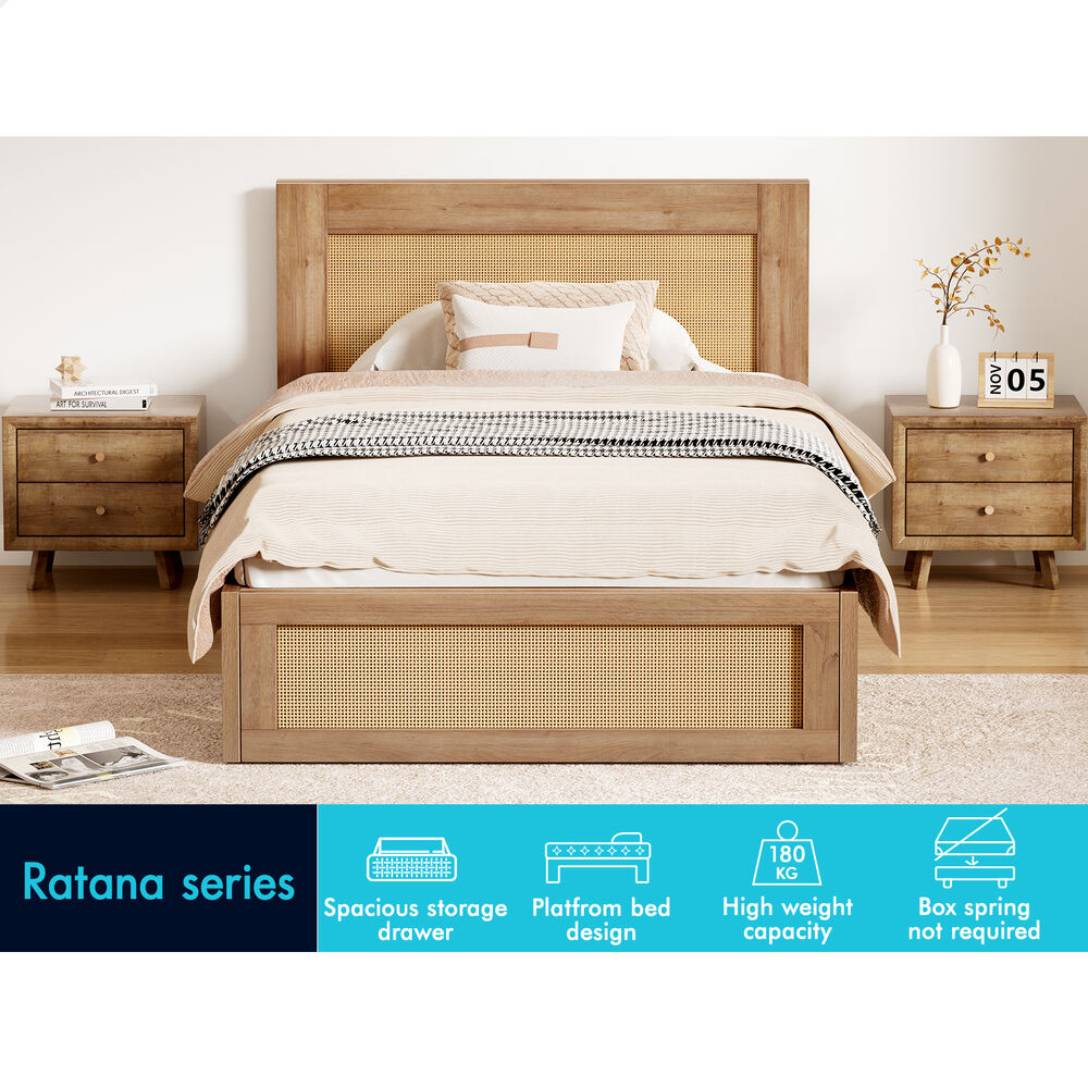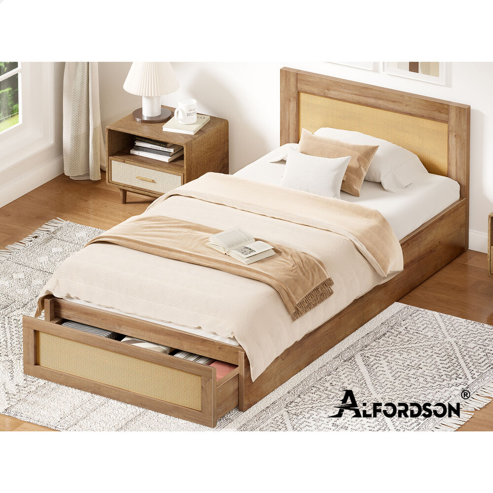 ALFORDSON Wooden Bed Frame King Single Rattan Bed Base with Storage Drawer Oak
