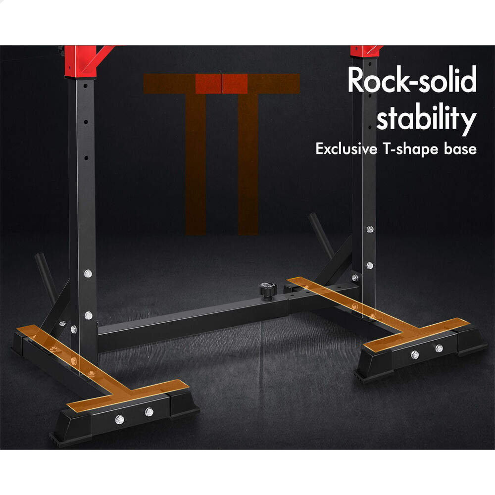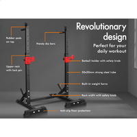 Constructed from quality steel, the squat rack is designed to be durable with 300kg weight capacity and offers rock-solid stability. The gorgeous powder-coated paint job will keep it looking fresh for years to come. Crafted with safety in mind, the rack is also equipped with sturdy rubber feet to keep the metal frame from damaging flooring and to keep the rack in place.