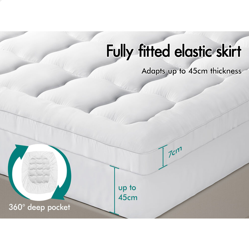Filled with eco-friendly microfibre filling, our mattress topper offers comfort without odours and allergens. Plus, the naturally breathable and moisture-wicking cover is hypoallergenic. It's easy to enhance your comfort or prolong the life of an older mattress with our topper. The 45cm fitted skirt keeps the topper firmly and smoothly attached to your mattress despite tossing and turning through the night, meaning less of a tangled mess in the morning.